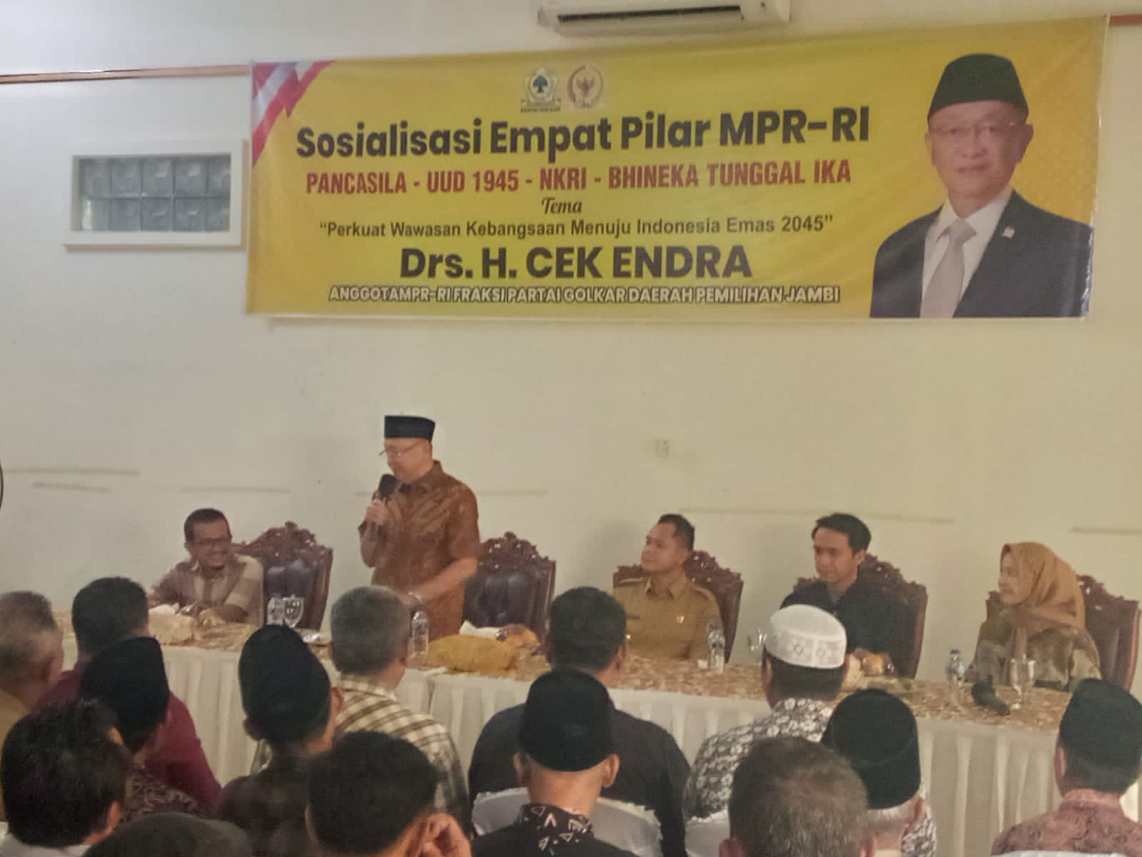 Dalam sosialisasi Empat Pilar yang kedua pada hari yang sama ini, yang mana pada paginya acara serupa digelar Cek Endra di kantor Camat Sarolangun, anggota Komisi XII DPR RI dari Fraksi Golkar memaparkan langsung Empat Pilar MPR-RI, merupakan pondasi, yaitu Pancasila, UUD 45, NKRI, Bhineka Tunggal Ika, yang wajib dipahami setiap kalangan masyarakat.