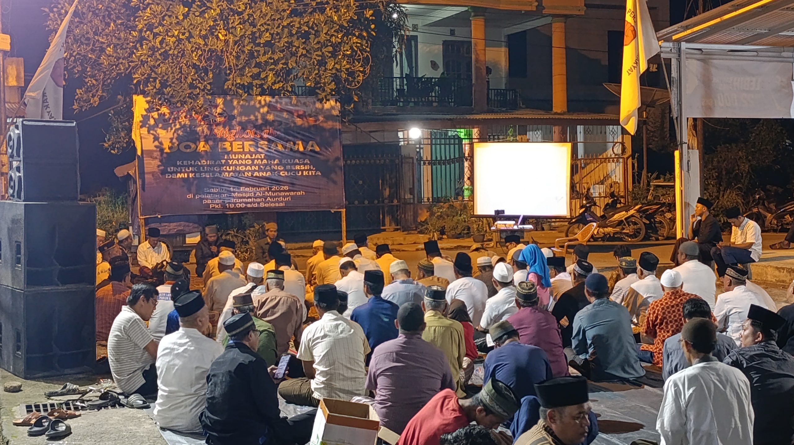 JURNALJAMBI.CO – Ratusan warga Aurduri menggelar doa bersama di Pelataran Masjid Al-Munawarah, Sabtu (14/02/2026) malam. Mereka tegas menolak rencana pembangunan stockpile batubara di kawasan permukiman padat penduduk.