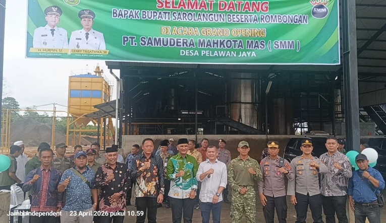 JURNALJAMBI.CO – Bupati Sarolangun H. Hurmin mengucapkan selamat dan mengapresiasi atas diresmikannya PT SMM (Samudera Mahkota Mas), sebuah perusahaan pabrik pengolahan kelapa sawit yang berlokasi di Desa Pelawan Jaya, Kecamatan Pelawan, Kabupaten Sarolangun, Kamis 23 April 2026.