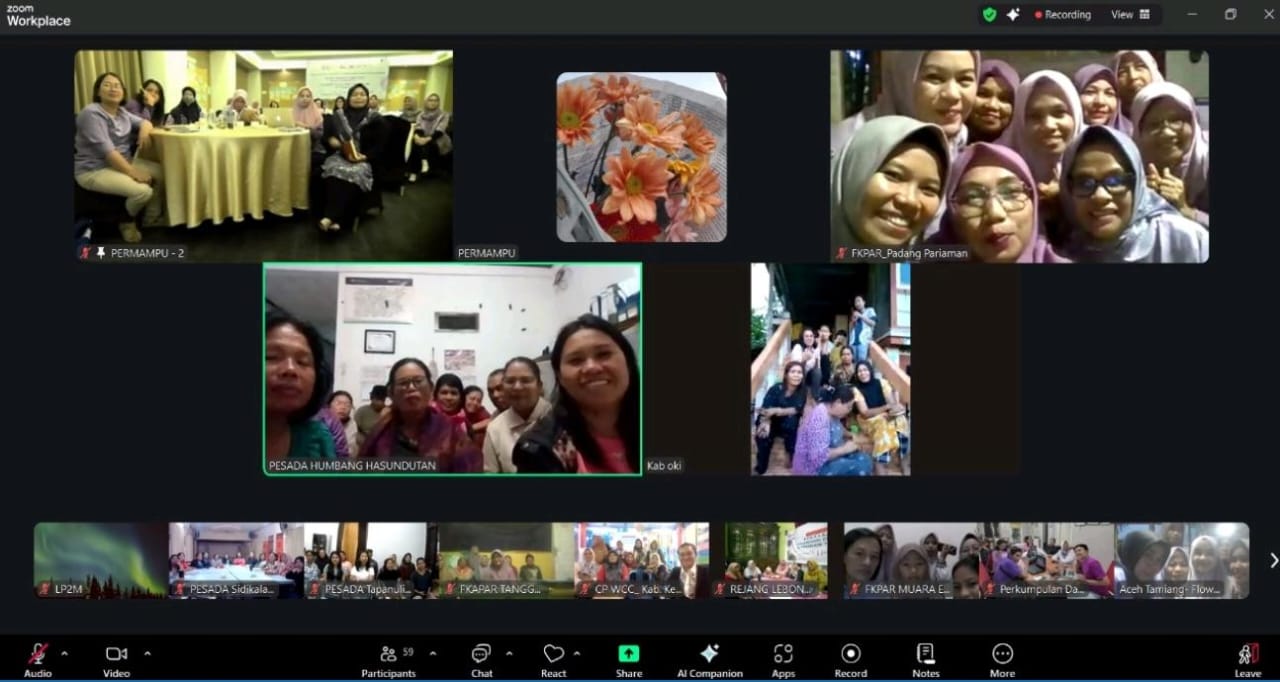 Kegiatan ini diikuti dari 30 titik Zoom di 37 Kabupaten/kota di 8 Provinsi Pulau Sumatera dengan melibatkan 391 peserta diantaranya 369 perempuan akar rumput, 37 perempuan muda, 3 dengan disabilitas dan 22 laki-laki.