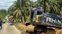 Proses perbaikan jalan yang amblas di Desa Kampung 9, Kabupaten Batanghari, yang dilakukan oleh PTPN IV Regional 4 dengan menggunakan alat berat.