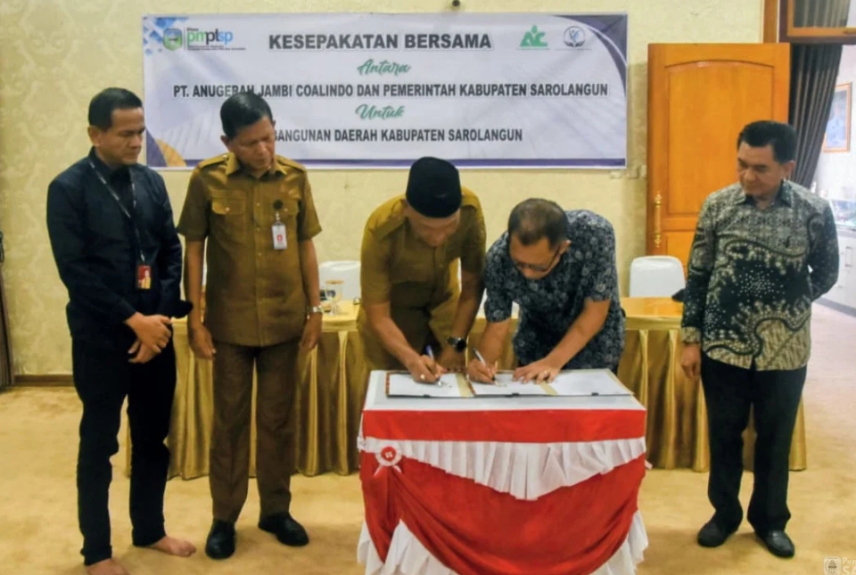 JURNALJAMBI.CO – Bupati Sarolangun H. Hurmin menandatangani Memorandum of Understanding (MoU) tentang pemakaian dan perawatan Jalan Simpang Vitco-sepintun antara Pemerintah Kabupaten (Pemkab) Sarolangun dengan PT. Anugerah Jambi Coalindo (AJC), Selasa siang 23 Nopember 2025 di rumah dinas Bupati Sarolangun.