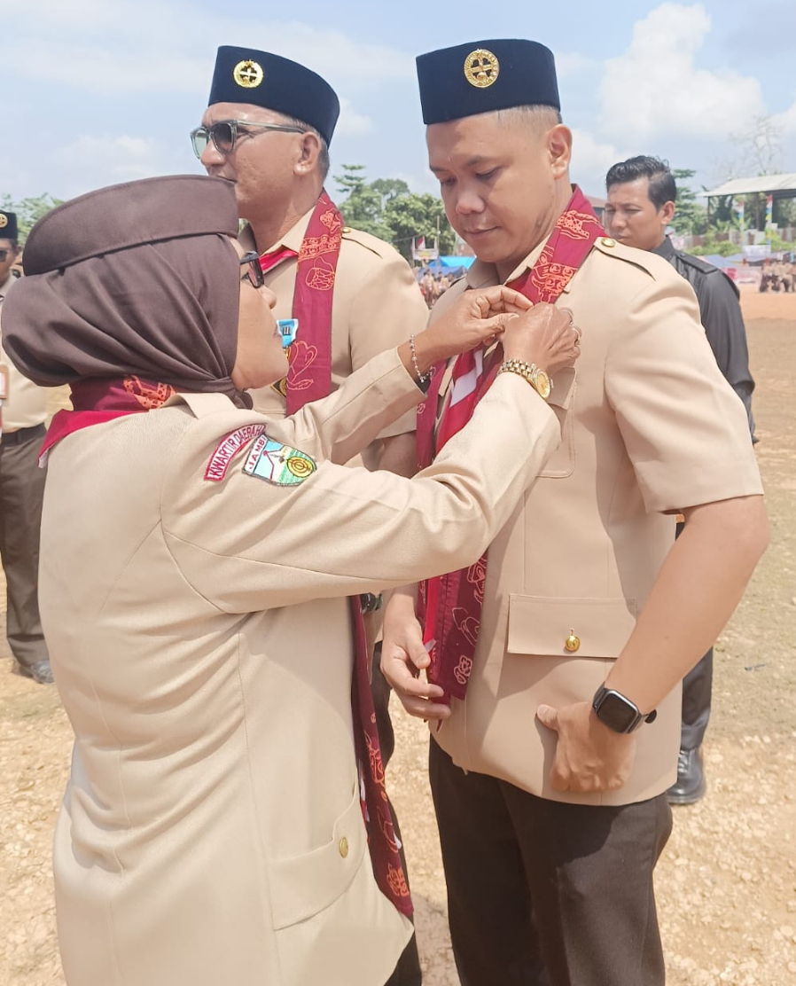 JURNALJAMBI.CO – Bupati Sarolangun H. Hurmin dan Wakil Bupati Sarolangun Gerry Trisatwika menerima Tanda Penghargaan Lencana Pancawarsa dari Gerakan Pramuka tingkat Kwartir Cabang (Kwarcab ) Sarolangun, Kamis 25 September 2025 dalam momentum Apel Besar HUT ke 64 Gerakan Pramuka tingkat Kwarcab Sarolangun, di Kecamatan Mandiangin.