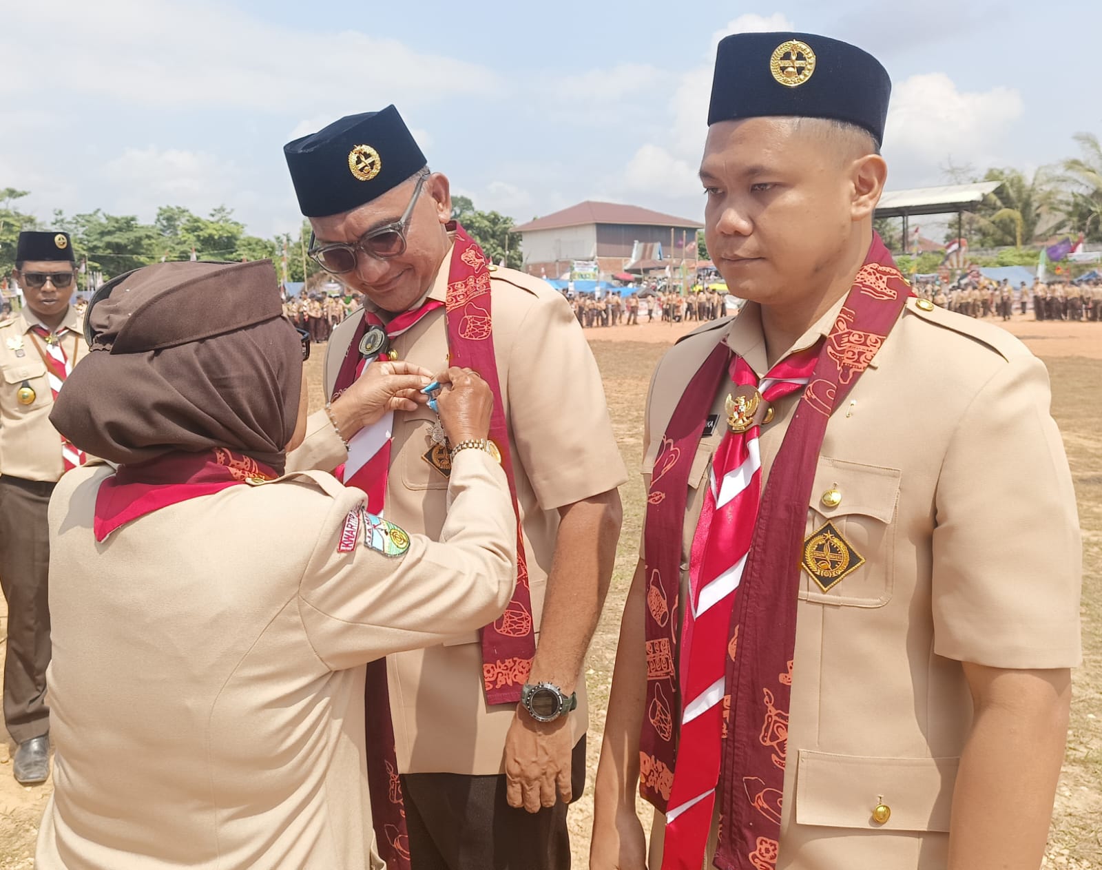 Tanda Penghargaan Lencana Pancawarsa disematkan oleh perwakilan Ka Kwarda Jambi kepada Bupati Hurmin sebagai Ka Mabicab Sarolangun dan Wabup Gerry Trisatwika sebagai Waka Mabicab Pramuka Sarolangun.